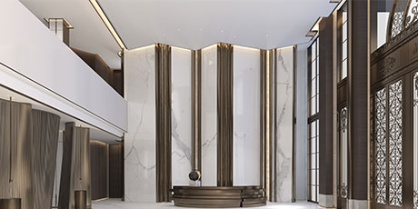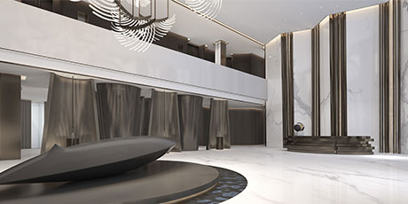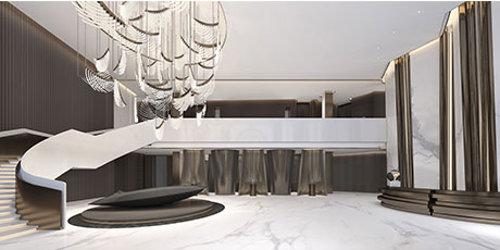 大堂以大尺度挑高設計,加上有序交互的幾何形體與線(xiàn)條,讓空間極具延展性。九尊水滴藝術(shù)裝置成為大廳另一點(diǎn)睛之筆,設計師伽馬取意“九眼水滴,禪心觀(guān)上”。從空中飛泄而下的藝術(shù)燈飾,構思于蘇州非遺文化“折扇”。晶 瑩透亮似羽似扇的造型,表達輕盈與厚重,質(zhì)樸與力量。
