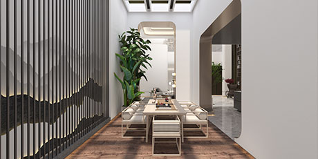 天窗茶室與客廳相連,此處運用東方元素,立面采用格柵山水裝飾和圓形窗格造型,恬淡雅致、氣韻生動(dòng),于素簡(jiǎn)中透出東方禪意??蛷d、酒吧、茶室與此共享獨成風(fēng)格,又融洽貫通,集功能、美觀(guān),實(shí)用于一體。