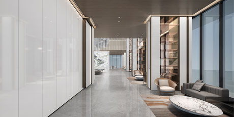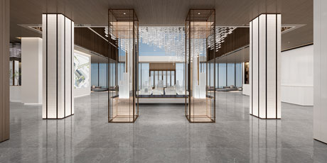 售樓處功能區分散在整個(gè)空間中,形成流暢清晰的循環(huán),平衡了隱性和顯性之間的關(guān)系,在布局中也融入了未知和交互,以留出更多的想象空間。未知刺激下的人與靜態(tài)物品的互動(dòng),可以為空間注入活力。整個(gè)空間營(yíng)造 出簡(jiǎn)約的空間基調。帶有紋理的大理石和木制藝術(shù)裝置被引入,以減輕廣闊空間的空虛感??臻g中的物品與自然和藝術(shù)相連。只有在與人互動(dòng)時(shí),他們才能開(kāi)始扮演角色。淺色調平衡了建筑結構的厚重感,也豐富了空間 的層次感。入口處下沉的燈飾結構打破了空曠感,同時(shí)也豐富了視覺(jué)體驗。水吧、休息區和洽談區緊密相連,共同形成社交的錨點(diǎn)。整個(gè)售樓處以藝術(shù)美學(xué)和極簡(jiǎn)主義為特色,激發(fā)人們與自然的互動(dòng)。